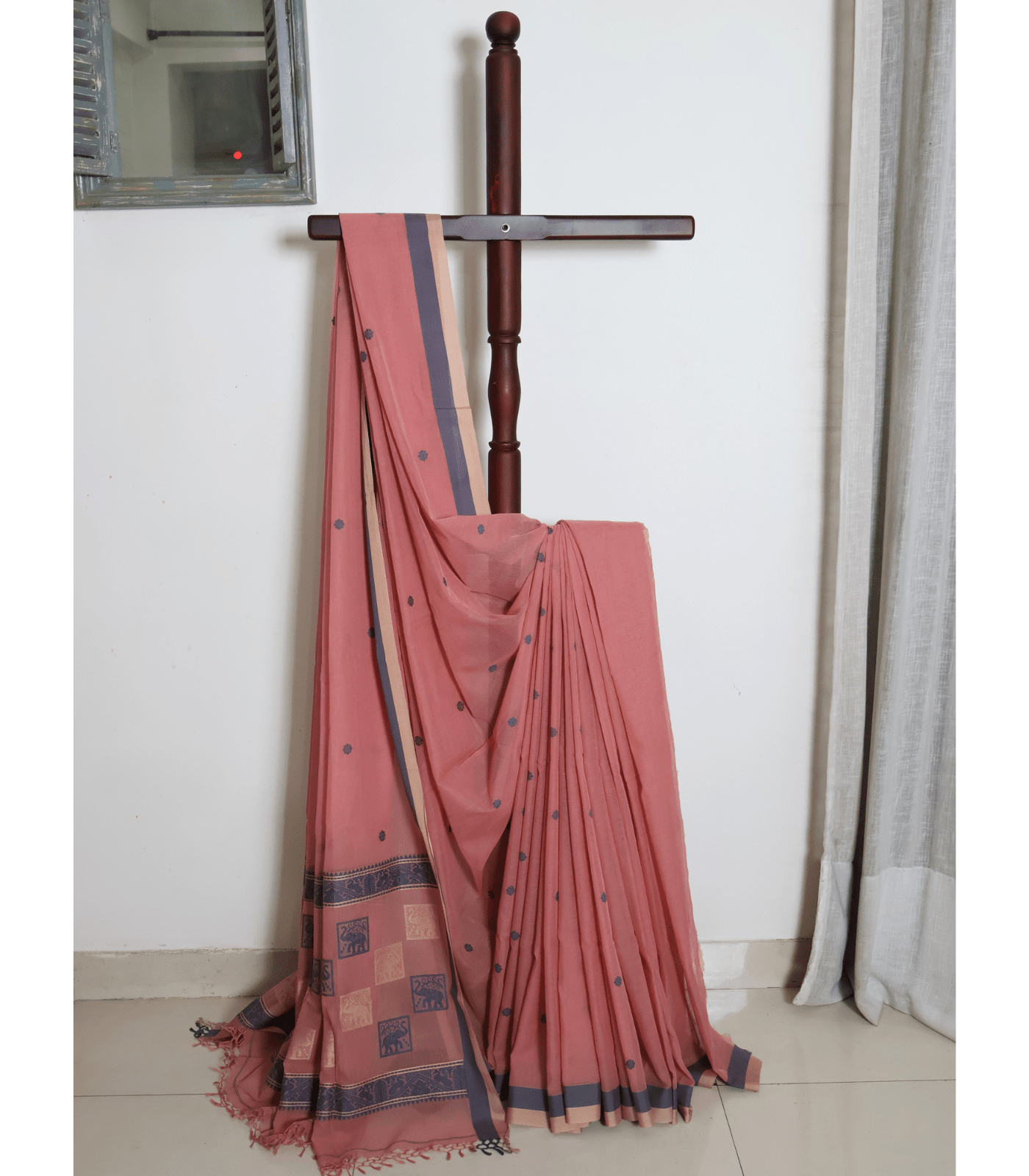 Dusty Rose Handloom Saree with Indigo Elephant Motifs