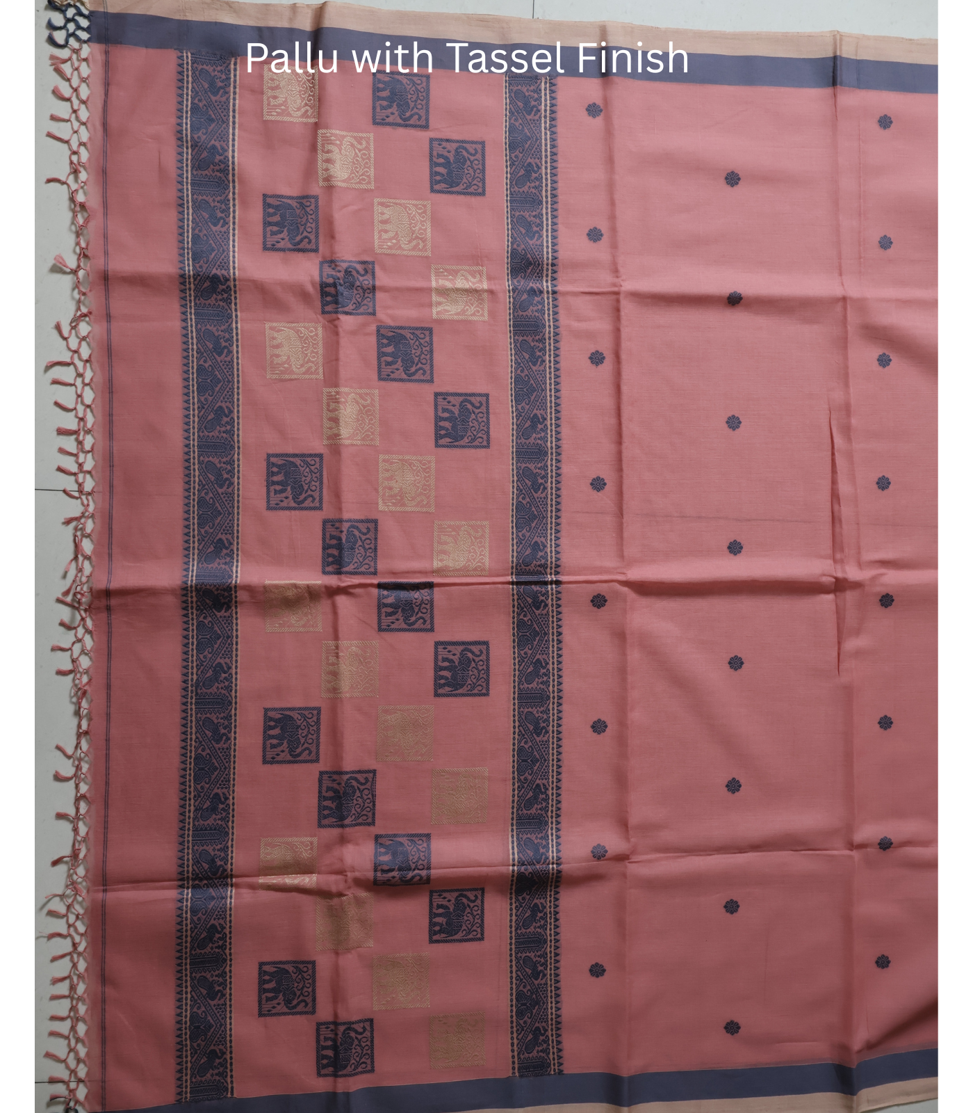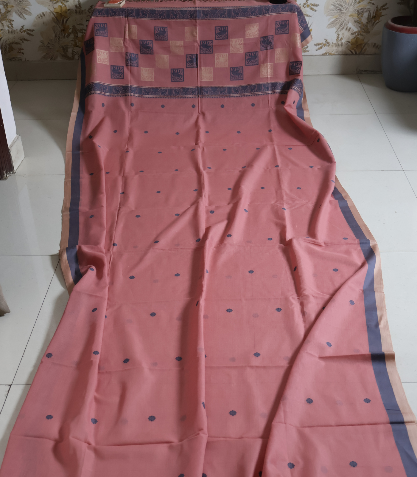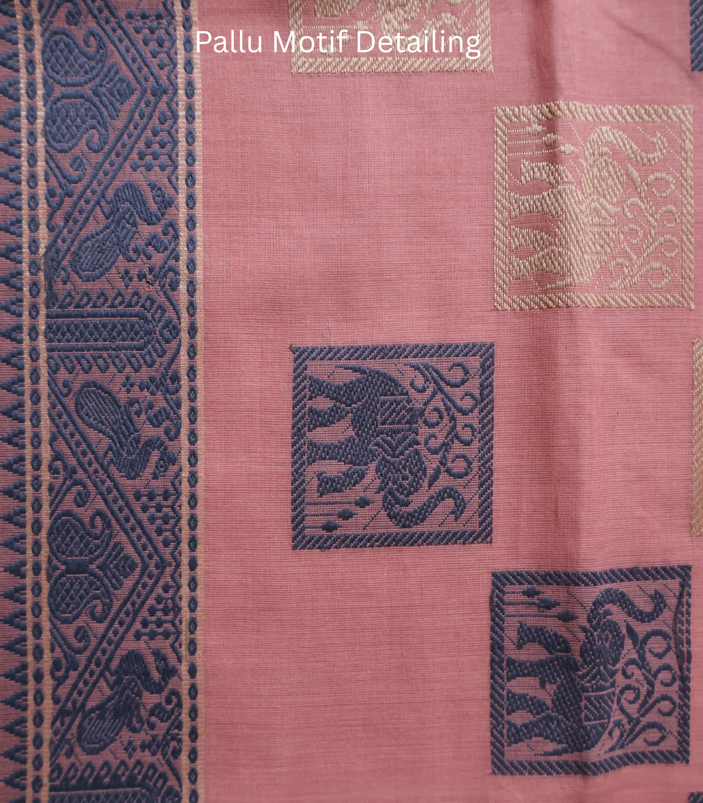 - Border: A striking indigo/navy woven border on both sides. Detailed with temple-inspired and geometric patterns