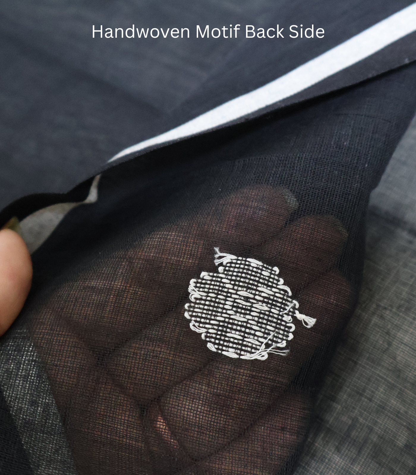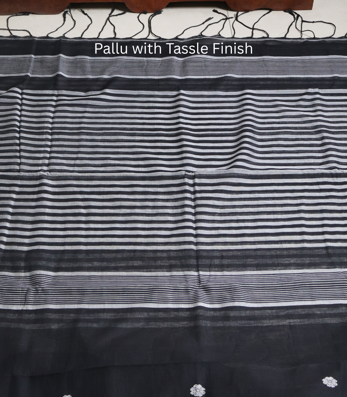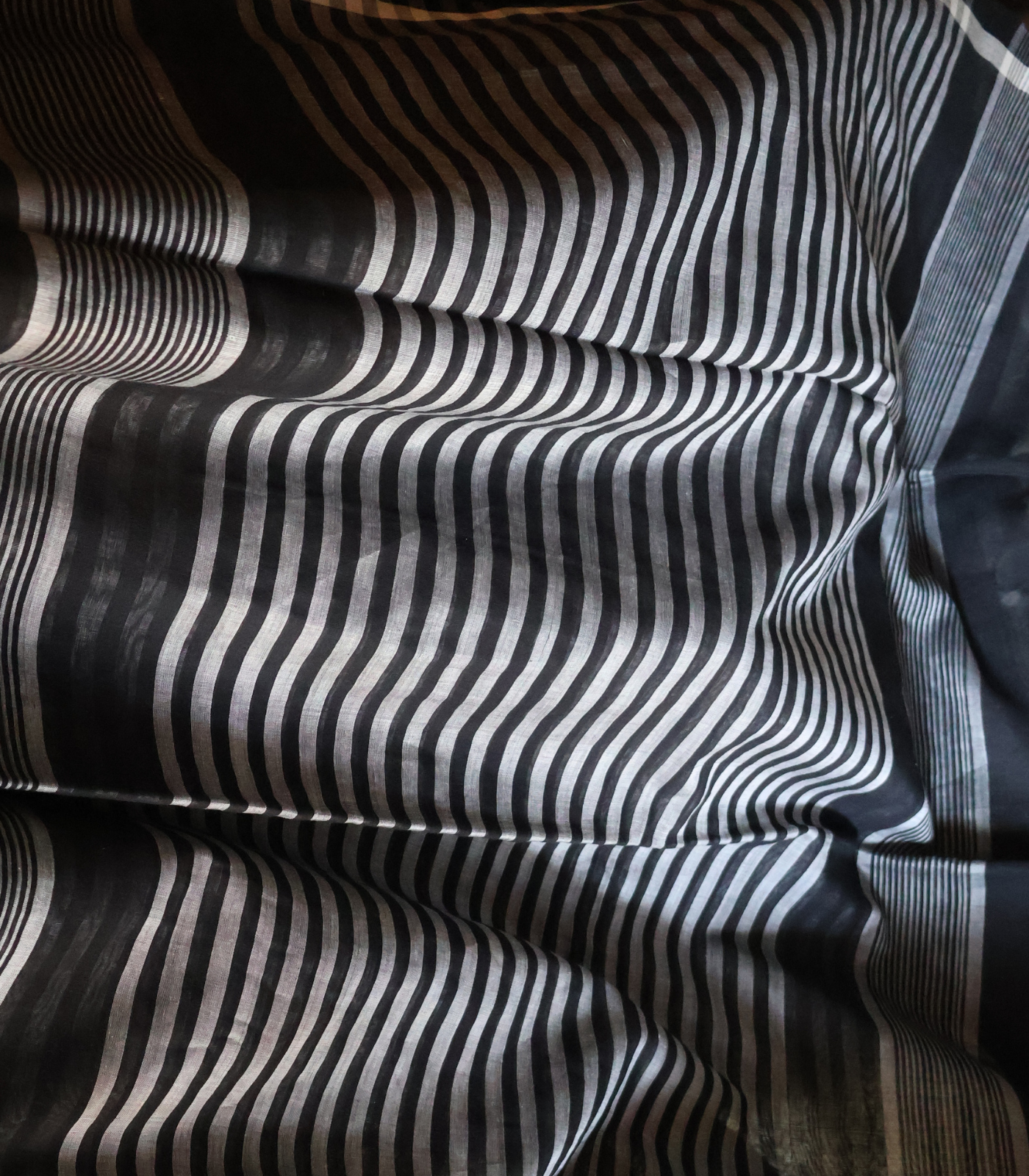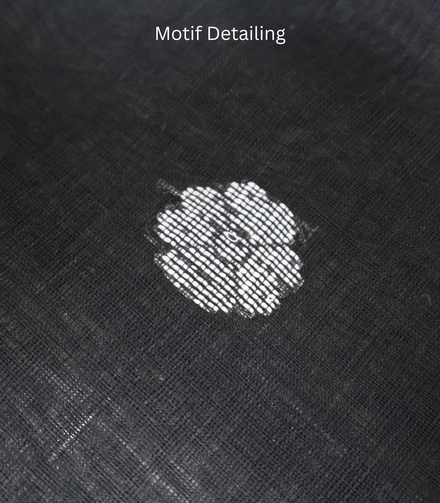 - Colour: The base is a deep jet black / charcoal black, beautifully contrasted with soft silver-grey stripes along the border and pallu. The subtle white butis scattered across the body add a gentle shimmer without overpowering the minimal aesthetic