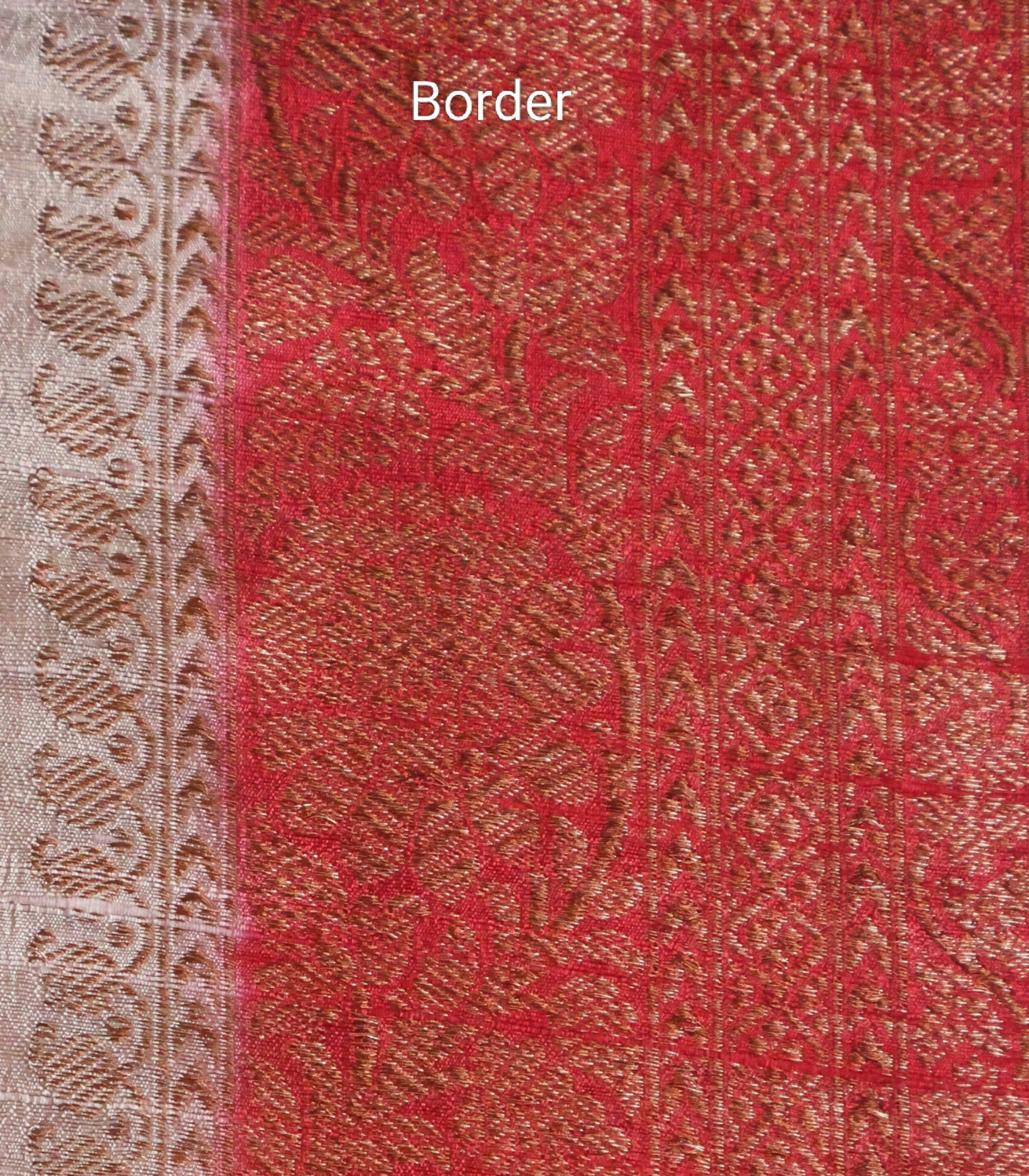 • Border & Pallu: A striking contrast of deep vermilion red enriched with intricate gold zari weaving