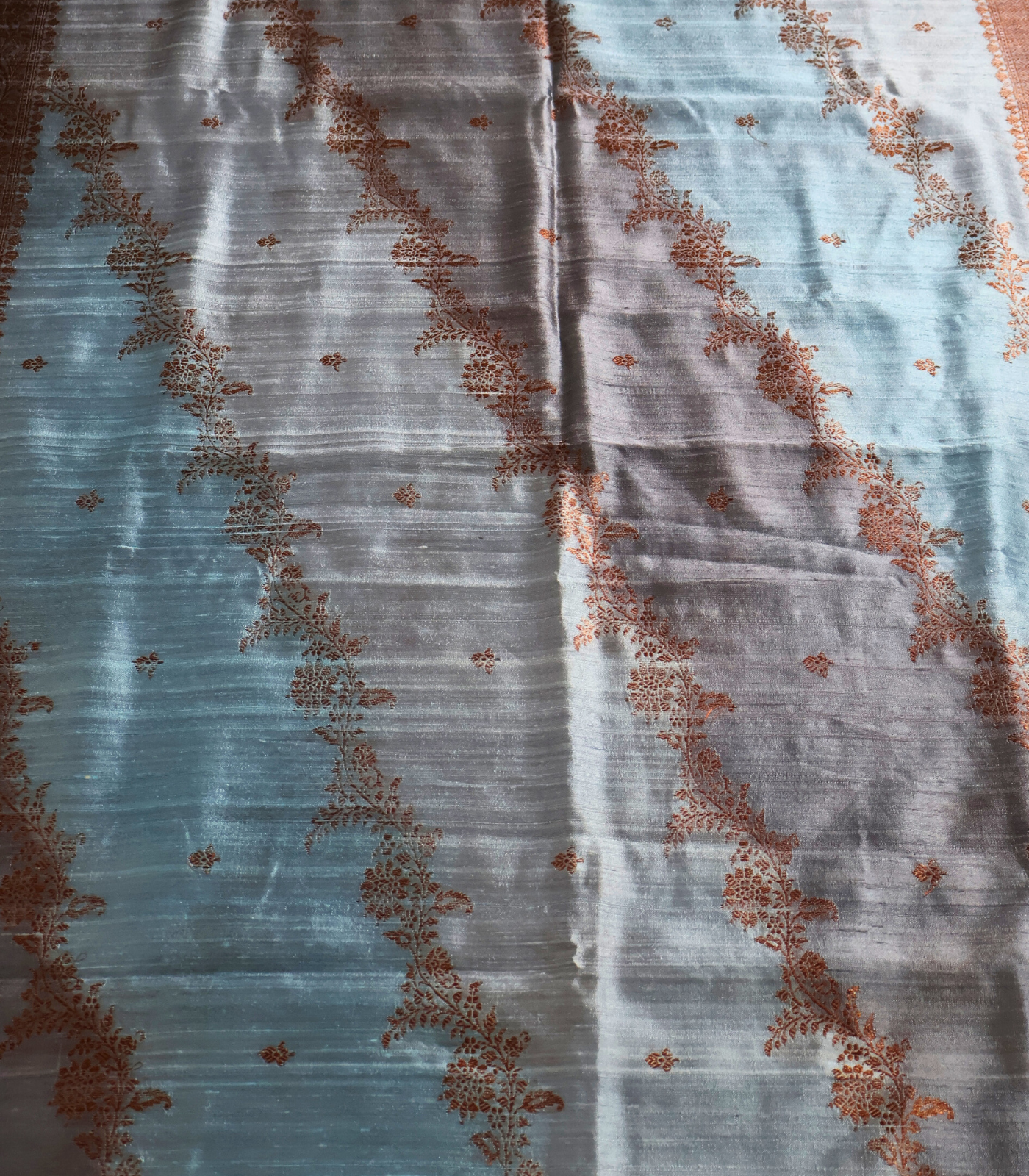- Accentuating this cool-toned canvas is intricate antique copper zari work — not too bright, not overly golden — but a warm, burnished copper hue that lends a vintage royal appeal. The contrast between the cool blue-grey base and the warm copper detailing is beautifully balanced and sophisticated