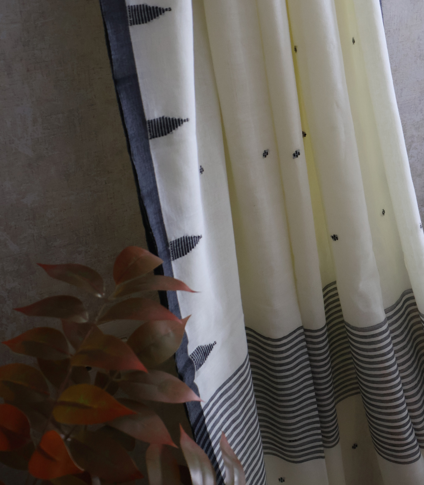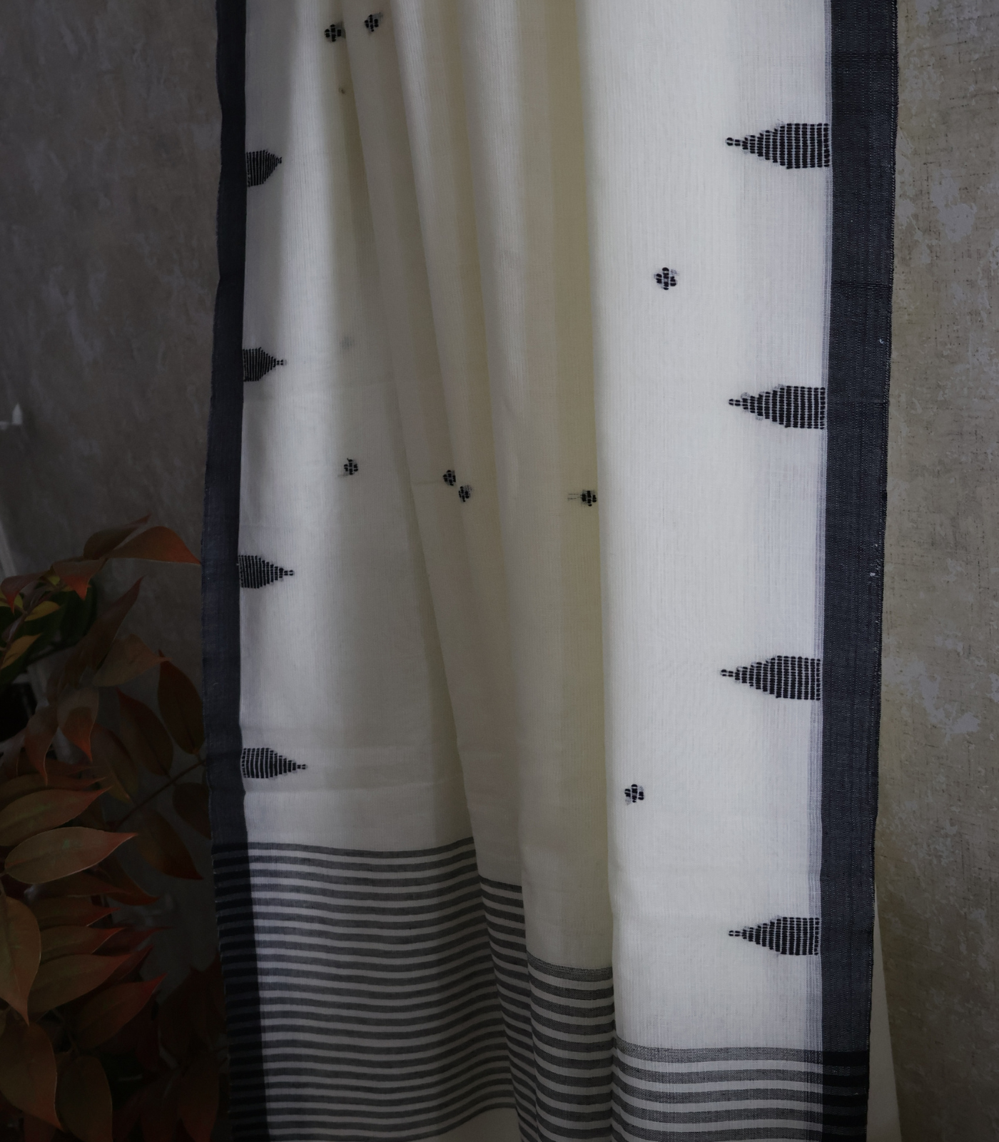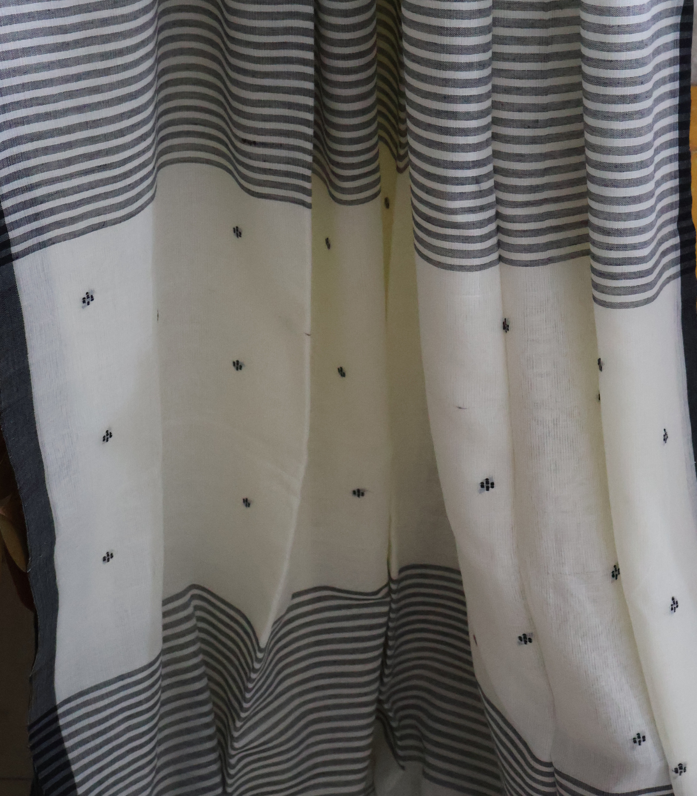 - Body: This saree has soft warm white base. The saree has a creamy, mellow tone that gives it an elegant, understated richness. The border features charcoal grey stripes, giving it a classic, timeless contrast. Small black woven butis are scattered across the body, subtle and minimal
