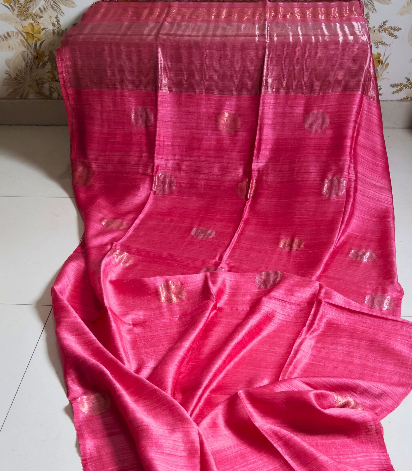 - Motif & sheen: Antique gold zari — delicate woven motifs scattered on the body and subtle border detailing, giving a soft metallic glow without overpowering the pink