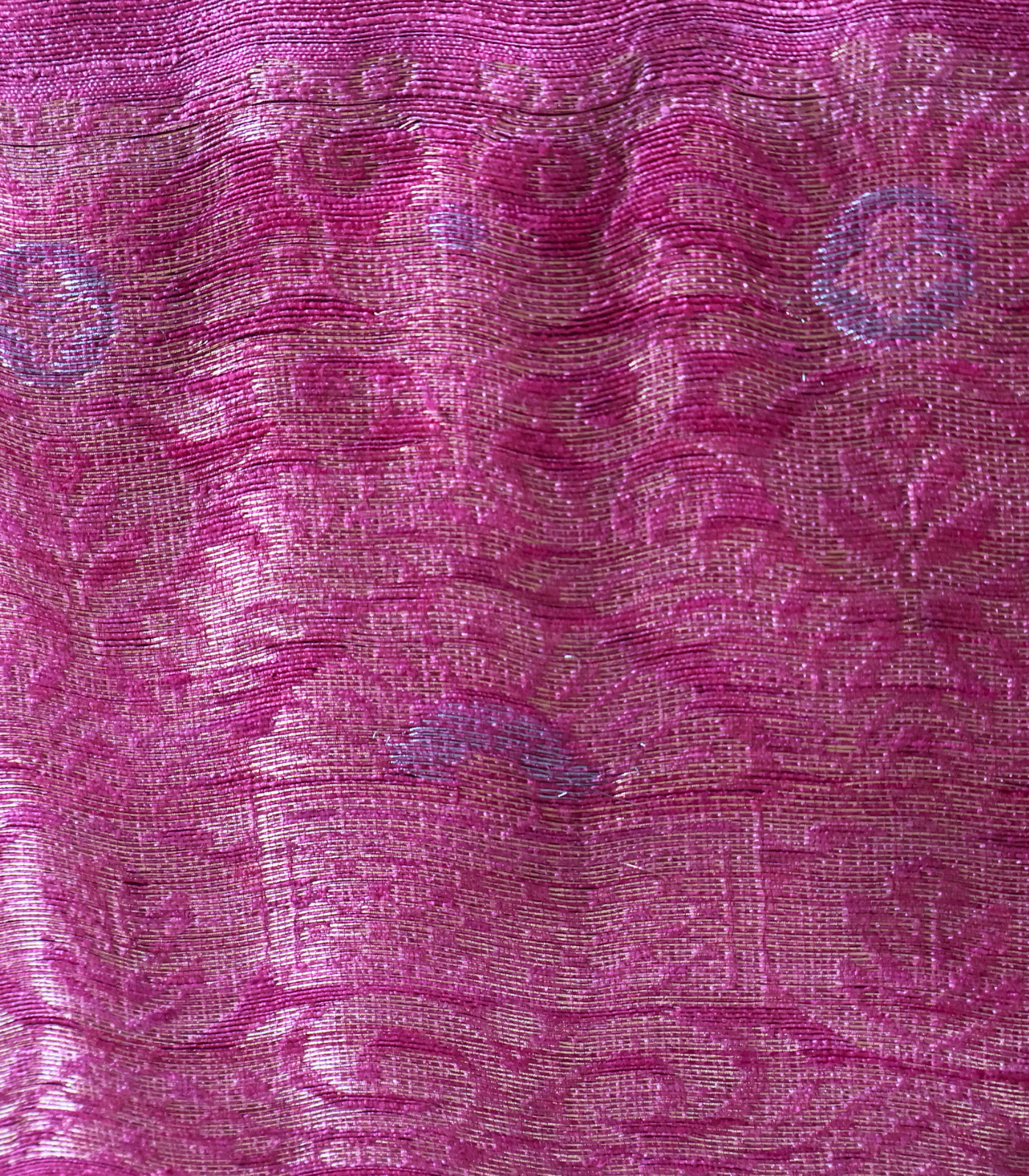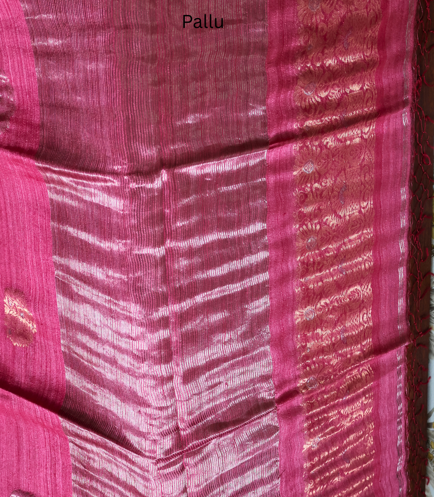 - Border & pallu shading: Berry pink / wine-rose tone — visible in the lower border and pallu area, adding a darker, richer gradient effect