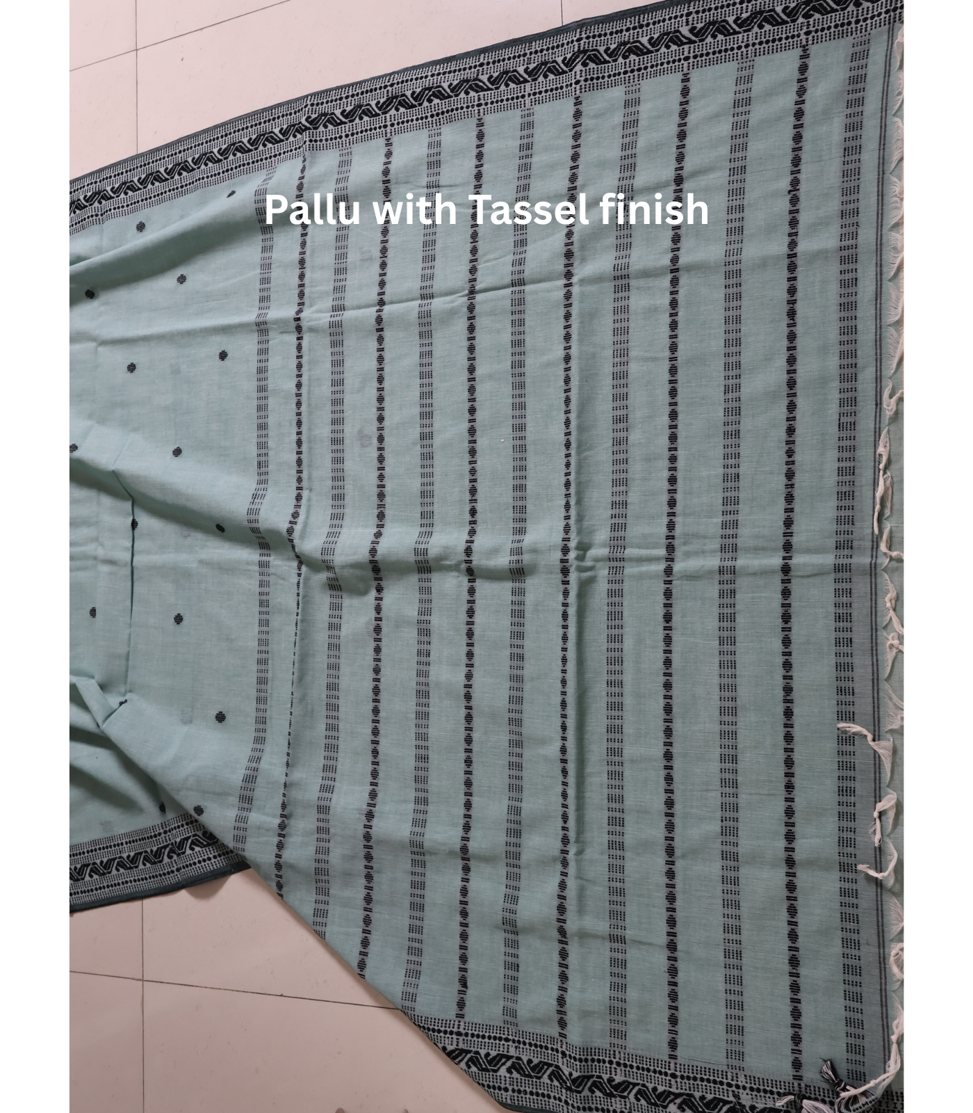 • One of the most recognizable elements of a Dhonekhali saree is its clean, narrow border. The sarees are breathable, airy cotton with gentle body, less gauzy than mulmul, less heavy than khadi — a balanced texture, maintains a neat fall, giving a structured silhouette
